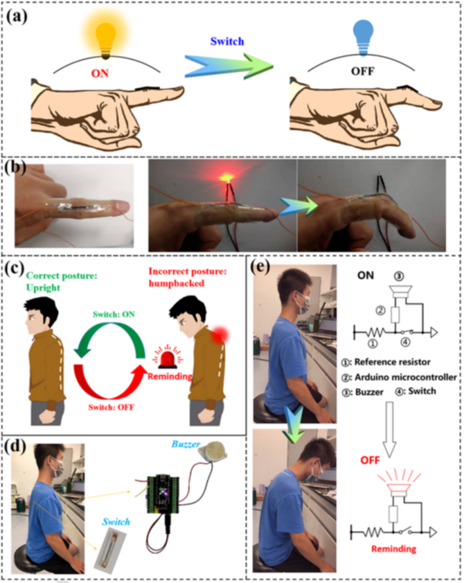 图5 (a) 将开关安装在人的手指上,作为可穿戴式电路控制应用的说明;(b) 由连接在手指上的开关和 LED 组成的 LED 电路的光学图像,其中 LED 灯的开/关通过手指的简单弯曲来控制;(c) 通过背部姿势校正器监测和提醒人体姿势的示意图;(d) 背部姿势监测与提醒应用示范;(e) 背部姿势矫正器的工作过程和其开关的工作机理。