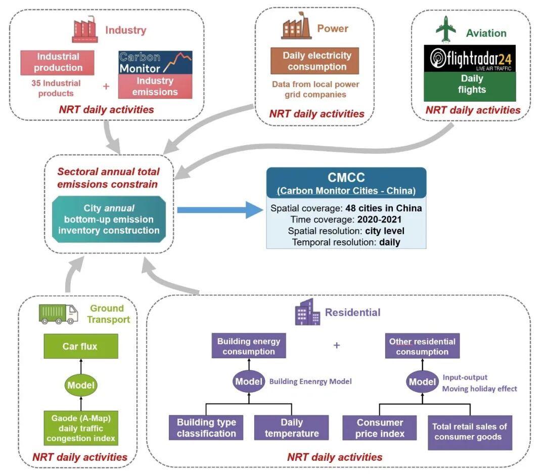 本文通过对中国48个城市分部门碳排放进行估算,构建了CMCC(Carbon Monitor Cities-China)数据集。该数据集涵盖了2020年至2021年中国48个高排放城市分部门的日尺度排放,包括电力、住宅(建筑和服务)、工业、地面交通和航空五个部门。该数据集致力于及时为城市和决策者提供评估缓解政策效力的关键信息,支持科学界更好地了解城市级别的每日排放动态。