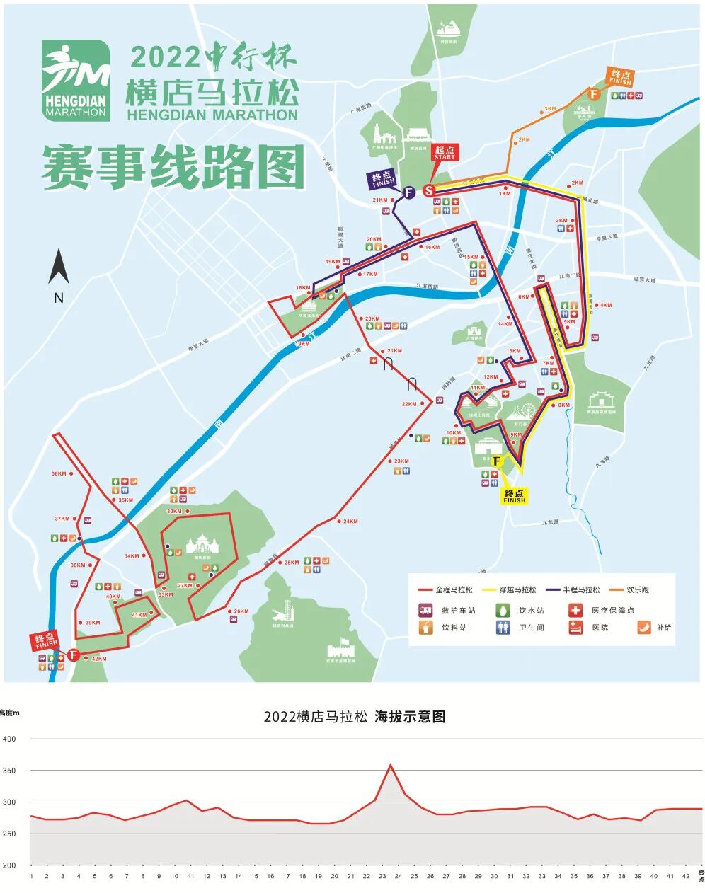 马拉松:明清宫苑(起点)→环城北路→都督北街→度假村路→康庄南街→康庄南街与江南中路路口折返→康庄南街→金佛庄路→长征路→秦清路→秦王宫景区→影视大道→清明上河图路→清明上河图景区→秦清路→度假村景区→万盛南街→万盛北街→华夏大道→影视大道→华夏文化园→滨江路→过隧道→国防路→圆明新园春苑景区→机场路→机场路与华夏大道路口折返→玮九路(过横店机场)→江南二路→圆明新园夏苑景区→夏苑正门停车场(终点)。