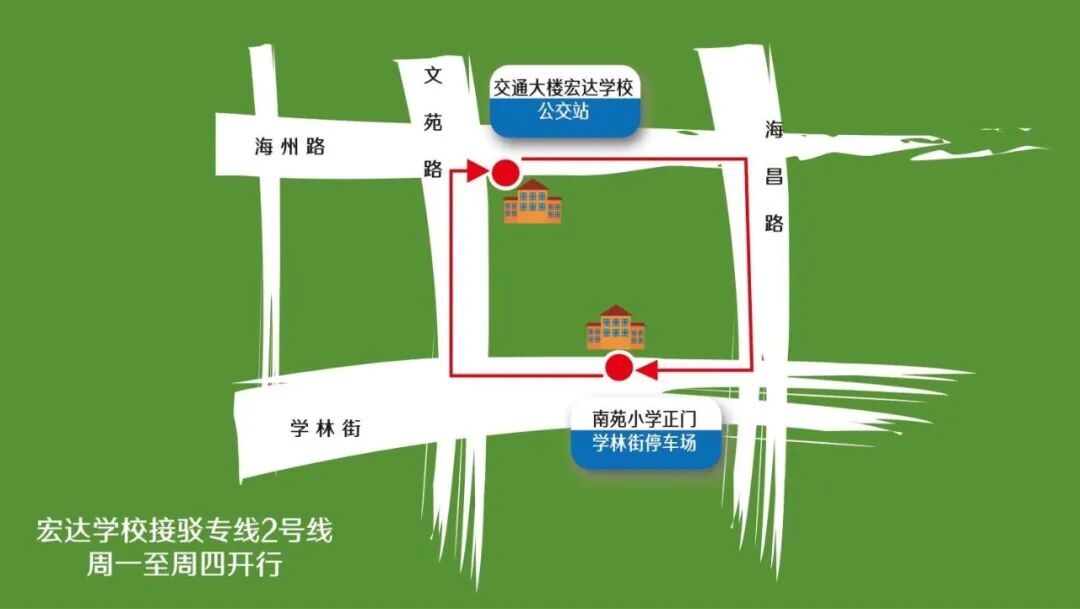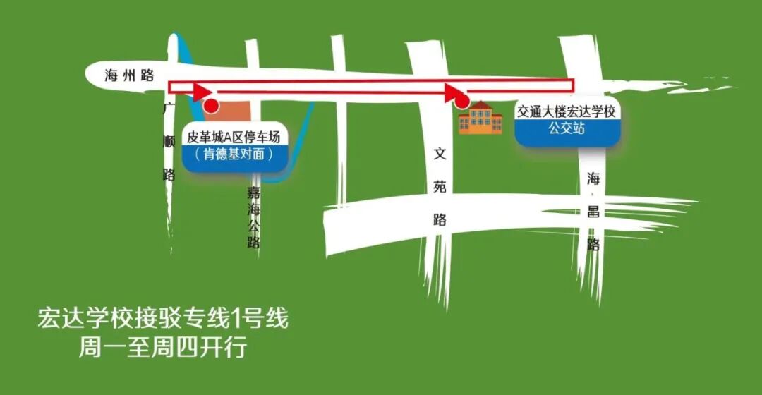 ●宏达学校接驳专线2号线的路线停靠站点为学林街(南苑小学正门)、交通大楼(宏达学校)公交站点(海州路南侧)。学林街出发的首班车发车时间为18:10,末班车到20:30,宏达学校出发的首班车时间为18:35,末班车到20:40,一共设有3辆大型普通公交车,每6-7分钟一班。●周五回家日开设的线路停靠点在皮革城A区停车场、海洲大饭店公交站点(双侧站点均停靠)、交通大楼(宏达学校)公交站点(海州路南侧)。发车分两个时间段,下午皮革城出发的首班车发车时间为15点整,末班车到16:30,宏达学校出发的首班车时间为15:35,末班车到16:40;晚上皮革城出发的首班车发车时间为18点整,末班车到19:40,宏达学校出发的首班车时间为18:35,末班车到19:50,一共设有6辆大型普通公交车,每5分钟左右一班。据了解,宏达学校的接驳专线将在11月1日开始实行试运营,家长们可以根据需要,把车辆停在学林街、皮革城停车场乘坐“宏达学校接驳专线”来接孩子,在试运营期间学生及家长可以免费乘坐接驳专线。后续会根据运行情况以及家长的反馈,还会对“宏达学校接驳专线”进行一些调整。