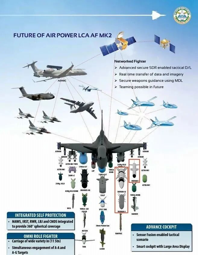 RudraM-III空射弹道导弹计划于2017年获得批准,开发试验将于2022年开始,投资48.5亿。本次展出的是模型,气动外形非常特殊,采用锥形弹头,圆柱形弹体,导线肋条一直延伸到尾部,前部弹体中部安装有4片X形布局较大的梯形翼,弹体尾部4片X形布局梯形尾舵,采用双脉冲固体火箭发动机。后部直径较大的助推器有一个过渡段,助推器配备了4片较大的后掠翼与4片较小的倒梯形舵面。RudraM-III目前可用信息很少,只知道是一枚1.6吨空对地导弹,带有300-400千克战斗部,以0.9马赫从11千米高度发射时射程为600千米,最高速度为5.5马赫,末端速度为1.5马赫,制导方式可能是和RudraM-II一样的INS+GPS修正,再加红外或雷达末制导。据说印度人计划用苏-30MKI挂载,还想配置给光辉MK1A/MK2,不过就那小个头想屁吃吗?
