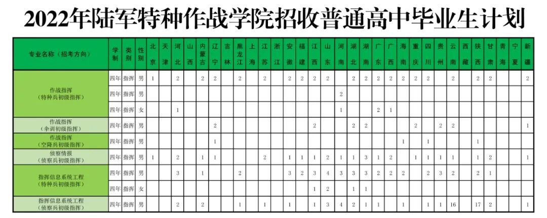 中国人民解放军陆军特种作战学院是全军唯一一所特种作战、情报侦察领域的高等教育院校,面向陆军、海军陆战队、空军空降兵培养特种作战、情报侦察领域军官和军士,承担全军狙击作战、军事体育领域人才培养任务,是全军侦察特战人才培养基地、全军高中级狙击手培训中心、全军军事体育人才培训中心、特种作战理论和战法训法研创中心。