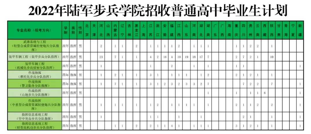 中国人民解放军陆军步兵学院是培养高素质、专业化步兵指挥军官的副军级高等教育院校,主要承担陆军步兵初级指挥军官、合成营指挥军官、军事学研究生人才培养任务,还面向海军陆战队、空军空降兵、联勤保障部队、武警部队等部队、步兵领域培养(代培)初级指挥军官,承担100多个国家军事留学生培养任务。现建有陆军步兵作战、政治工作2个军队级重点学科专业,设有军事指挥、军事装备2个硕士专业学位授权点。