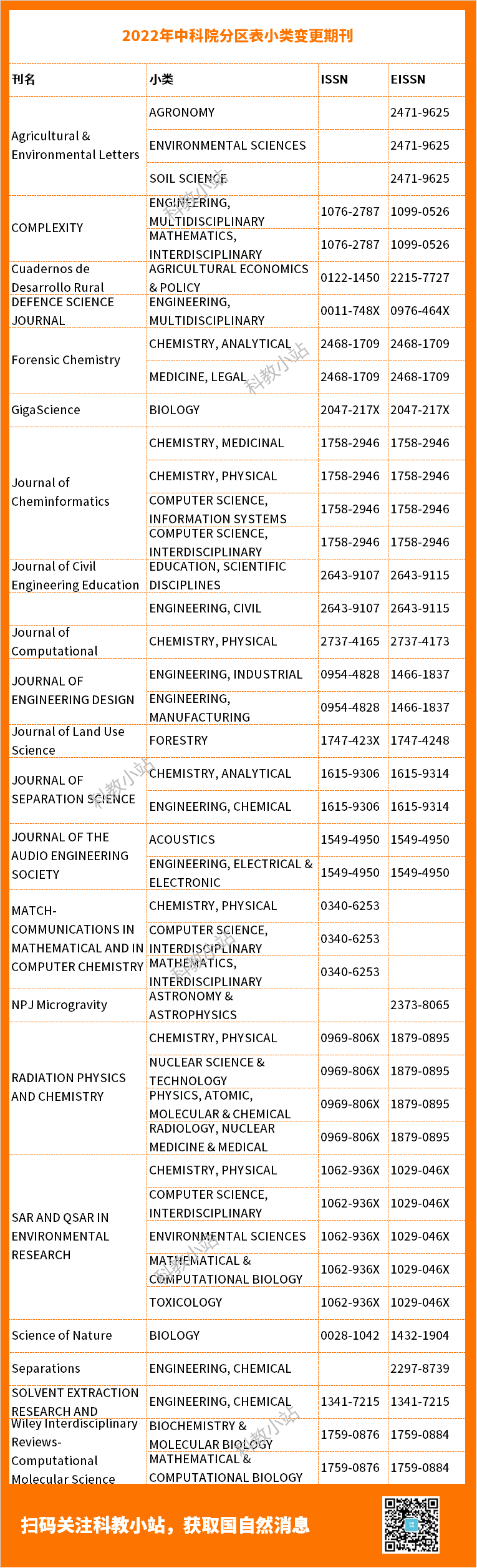 2022年期刊分区表,设置18个大类:数学、物理与天体物理、化学、材料科学、地球科学、环境科学与生态学、农林科学、生物学、医学、心理学、计算机科学、工程技术、管理学、经济学、法学、教育学、人文科学和综合性期刊。