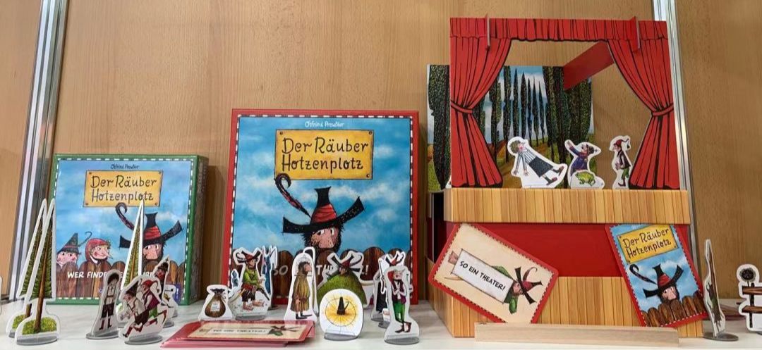 后来了解了一下,原来这是一个剧场版桌游,讲的是德国一个家喻户晓的童话故事《大盗贼》,小朋友们可以根据桌游里提供的情景剧卡片和舞台来互动表演舞台剧,很有意思。