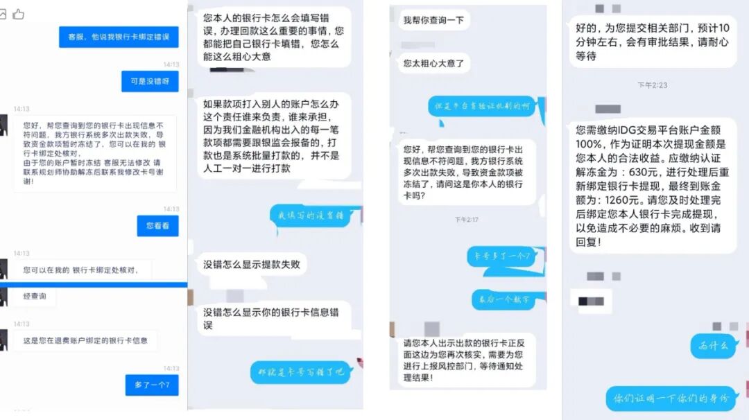然而,提现失败了。对方排查后指出是小白填错了银行卡号,多了一位数字,“客服的说法是信息填错导致账户被冻结了,需要继续注入钱才能解冻,金额是我的退款总数和刚才注入的50%,即5850元。”