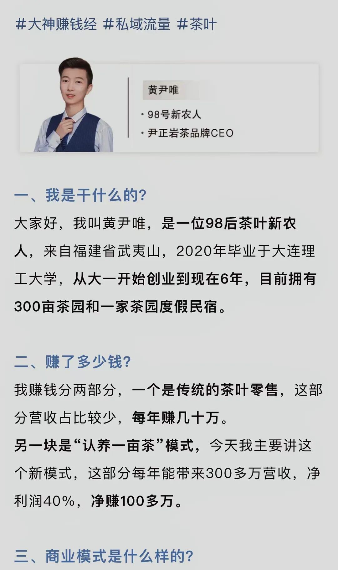 例如:百亩茶庄庄主@黄尹唯讲述如何利用认养+众筹裂变模式年入百万。