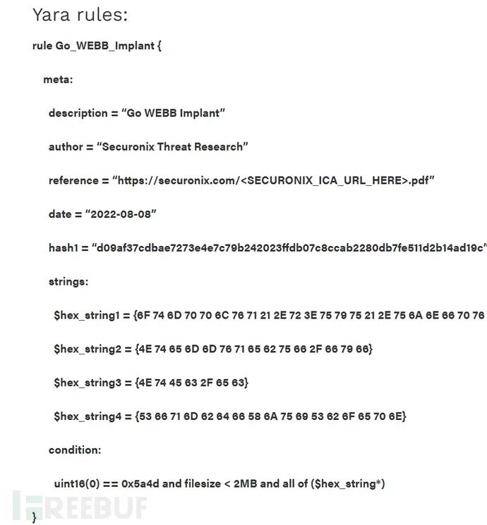 gobuild-ldflags="-w -s -H windowsgui"-xx.exeeg:基于 Golang 的恶意软件在APT组织中越来越受欢迎 。我们可以看到一些APT 组织转移到Go平台。重要的原因原因有:1.与 C++ 或 C# 编译的二进制文件相比,Go二进制文件更难分析和逆向工程;2. Go 在跨平台支持和编译方面也非常灵活。恶意软件作者能够使用适用于多个平台(例如 Windows 和 *NIX 操作系统)的通用代码库来编译代码。与此同也有相应的规则,如下图所示: