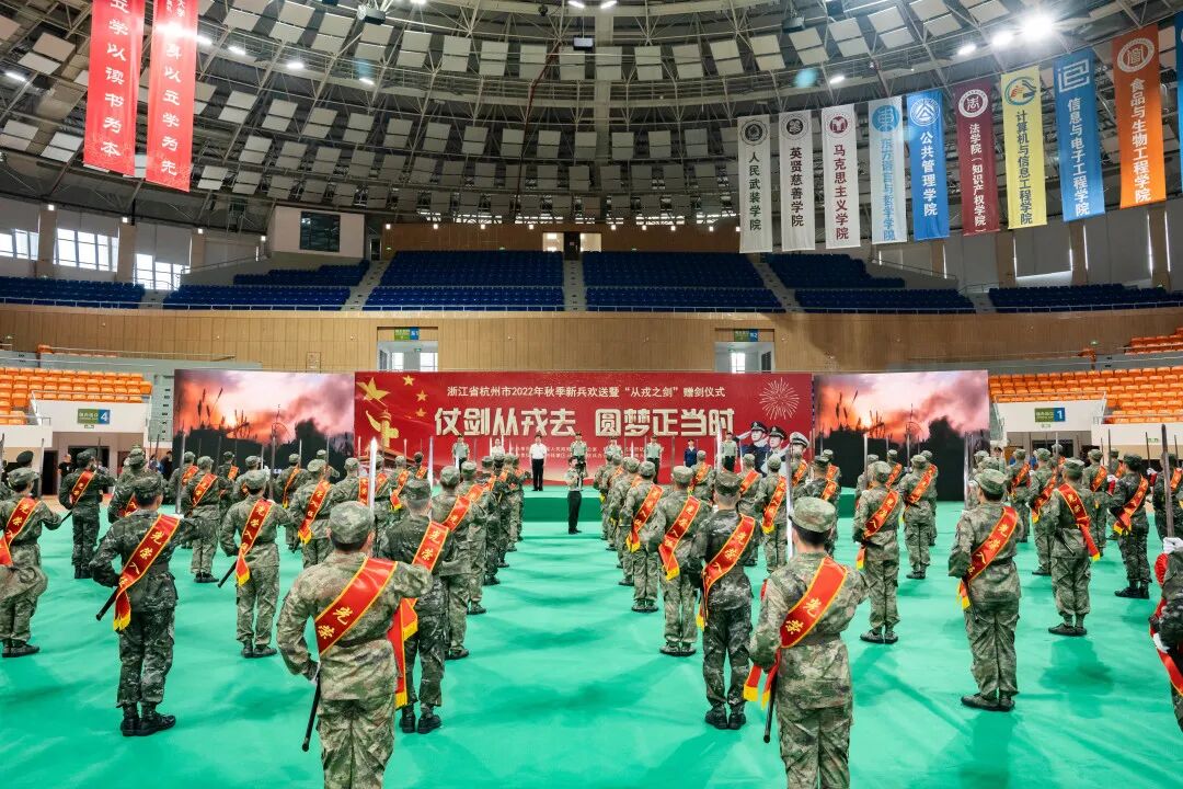 “‘从戎之剑’出鞘!”,随着一声令下,新兵们庄严亮剑,合唱歌曲《仗剑从戎去》,高亢嘹亮的歌声响彻整个浙江工商大学体育场馆。
