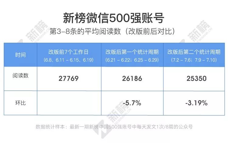 所有样本内的公众号3-8条的单篇平均阅读数,改版前7个工作日是27769,改版后第一个周期是26186,下降了5.7%。