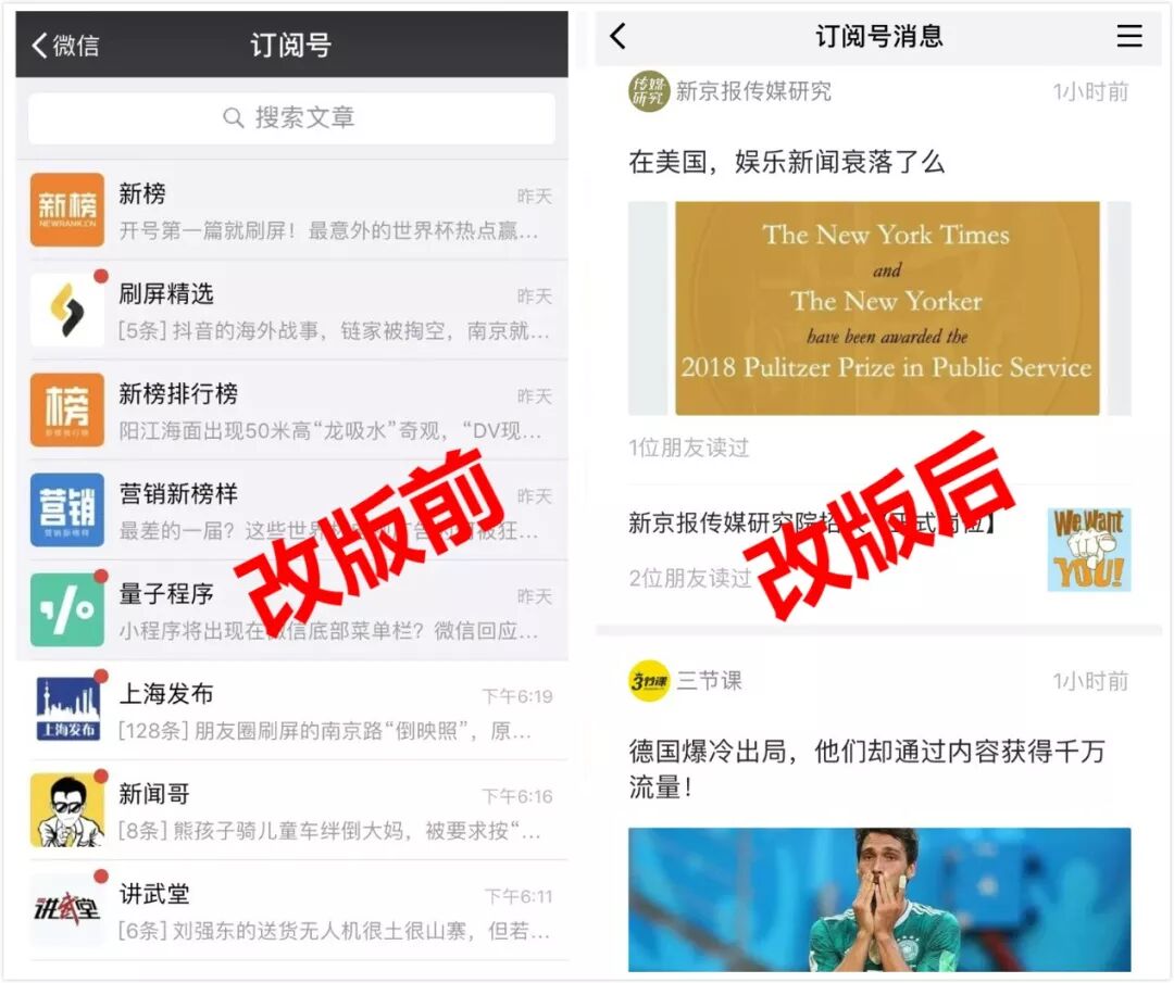 和“订阅号消息列表”相比,改版前后最大的差异,是可以直接看到头条和二条的“标题+头图”。