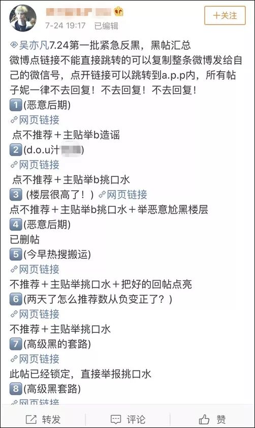 当天晚上,一名微博用户将“虎扑上凡凡的黑料”、举报原因与举报方法整理出了一条长微博,发到“吴亦凡”的超级话题下,呼吁“梅格妮”们集体举报。
