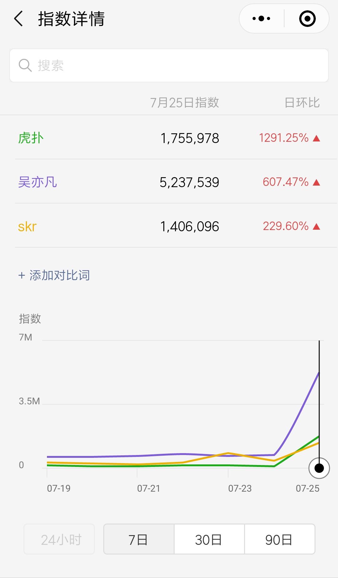 7月25日,#吴亦凡粉丝 虎扑#一度被顶上微博热搜,“吴亦凡”和“虎扑”的微信指数,也一日暴涨1200%和600%,一个专业术语“skr”,涨幅也达到了200%。
