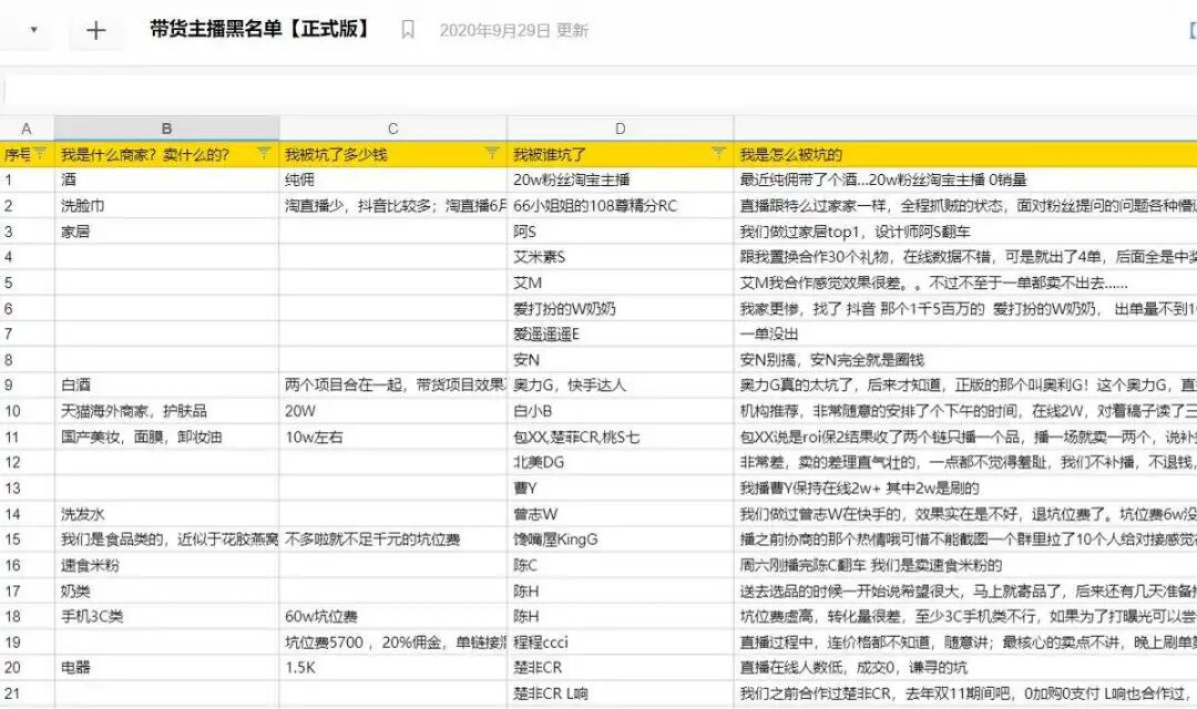 此前,业内曾流传一份“带货主播黑名单”,截至发稿前,名单上共登记了近500条商家被主播“坑害”的记录,不少知名主播赫然在列。