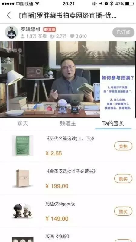 5月16日,罗振宇同时在映客、优酷、小米、斗鱼、淘宝五家平台直播卖书。在直播过程中,罗胖小耍心机,不停播报各平台流量数据,让平台争风吃醋为自己PK,最终,罗胖的人生第一套书《历代名篇选读(上、下)》从2.55元拍到30260元,溢价超过10000倍。各平台获得的打赏和点赞更是不计其数。