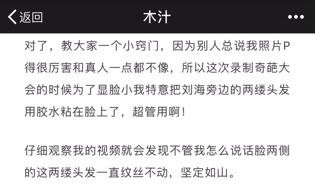 比如她自曝了一个很逗的细节:奇葩大会的时候为了显脸小,木汁特意把刘海旁边的两缕头发用胶水粘在了脸上……