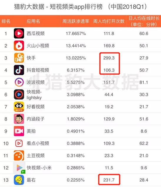 猎豹大数据2018 Q1的短视频榜单中,一个有趣的数据是最右App的周人均打开次数,居然仅低于快手,达到232次。相较之下,抖音只有106次。