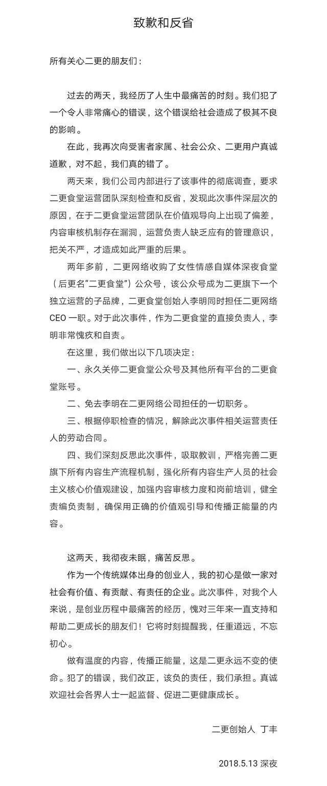 次日凌晨两点,二更食堂团队再次通过微博@二更食堂 发布道歉信并公布整改措施:二更食堂主编及编辑停职并做出深刻检讨,全体内容运营成员就文章存在的严重问题深刻反思,以正向价值观和社会责任心严格要求自身,从源头杜绝不符合社会主流价值观的内容。
