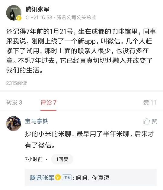 2010年12月,比微信面世的时间更早,米聊发布安卓版本。特别是两款产品存在诸多相似的地方,即便是七年后的2018年初,还有人不依不饶,在腾讯公关负责人张军感慨微信走过7年的微博下呛声:抄的小米的米聊……