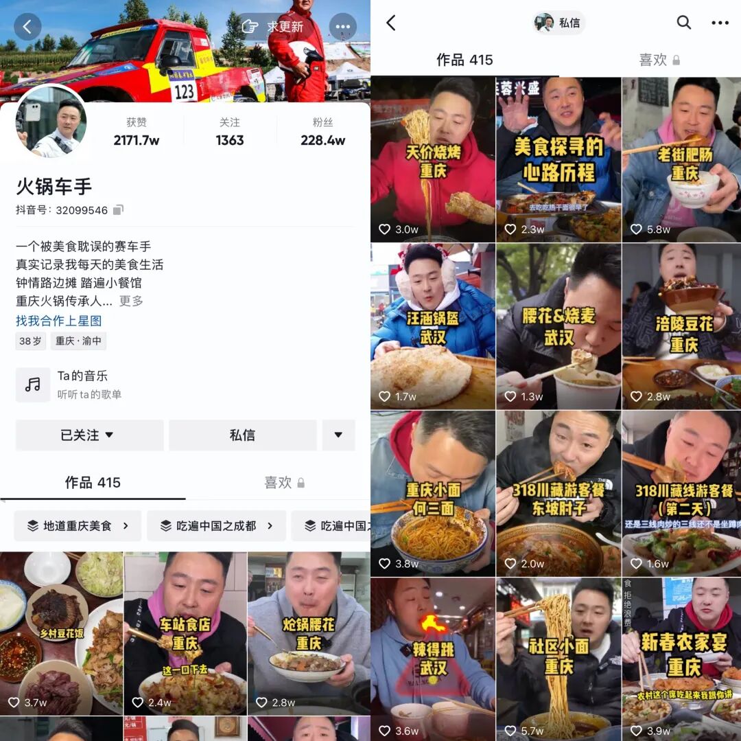 人如其名,“火锅车手”一如火锅般热情直率,“我这个人最大的特点就是喜欢在外面吃饭,我发现有人喜欢看我吃饭的视频,干脆转型做探店博主了”。视频中,他用一口流利的川渝方言介绍各种美食,也有不少粉丝用川渝方言与他评论互动。
