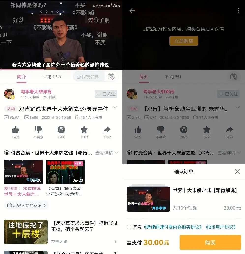 近日,#B站上线付费视频功能#登上热搜,又掀起了一波关于内容付费的讨论。B站UP主“勾手老大爷邓肯”在6月20日发布了付费视频合集,内容是对世界十大未解之谜和灵异事件的解说,包含10个视频。目前更新了第一期,播放页面显示,需支付30元购买合集才能观看,不能单集付费,观看渠道暂时仅支持手机App端。截至6月25日14时,该付费视频播放量达2.7万,忽略播放次数粗略预估,其收益最高约81万(包含平台分成)。有不少喜欢UP主的忠实粉丝选择付费支持,但从热搜投票结果来看,更多人表示不能接受付费视频功能,认为视频质量不高,不愿在大会员基础上二次付费。“勾手老大爷邓肯”的粉丝数也一路跌至115.9万,5天掉粉3万。据了解,这是B站近期面向UP主推出的付费稿件功能,尚在小范围内测中。类似的内容付费模式其实并不稀奇,从知乎、得到的知识付费,到微信公众号的付费图文,再到抖音、快手的付费直播,各大平台不断寻求更多元的商业变现形式,但让用户买单没那么容易。如今到了短视频直播时代,内容付费还有哪些关键点亟待探索?对于用户、创作者、平台三方来说,面对付费视频都要考虑一个“值不值”的问题。许多用户认为这次UP主的解说视频不值得花费30元,因为首先同样的故事在网上比较泛滥,可以从其他渠道免费获取。虽然UP主对内容进行了整合分析,但缺少独创性,毕竟灵异事件这种内容区别于专业干货,大部分观众是抱着猎奇娱乐的心态来消遣的。其次,在定价方面,UP主自制的视频时长20分钟左右,售价平均3元一期,必须打包购买整个合集;而B站一部付费电影的价格是3-10元,大会员还能享受半价。相比之下,观众可能会觉得付费视频的质量与价格不对等,偏贵了。对此,“勾手老大爷邓肯”表示只希望经济独立并且真心喜欢自己的人花钱购买这个系列,量力而行即可。如果团队能因此增加一些收入,之后或许可以扩大产能,去做更有趣的事情。从创作者角度出发,尤其是全职UP主,收入主要来源于B站的激励计划、用户充电、直播礼物、广告商单和橱窗带货等,“付费视频功能”则提供了一种新的变现方式。某受访UP主说道:“今年广告投放很艰难,不论大博主还是小博主,其实都不太好过。对于变现困难的UP主,特别是小体量的应该还是愿意尝试付费视频的,多少都是个赚钱的途径。”但多位UP主告诉新榜编辑部,目前没有打算尝试做付费视频,持观望态度。也有UP主直言不太敢用,担心因小失大,得罪大部分用户。影视区UP主“给我一个镜头V”拥有粉丝78万,正在更新的原创短剧《诈术第二季:犯罪日记》已获1246万播放,被粉丝当作电影来看。大约2个月前,主创陈一川收到B站运营询问,是否要开通付费稿件功能,内部会给测试名额,他没有答应。![]()
