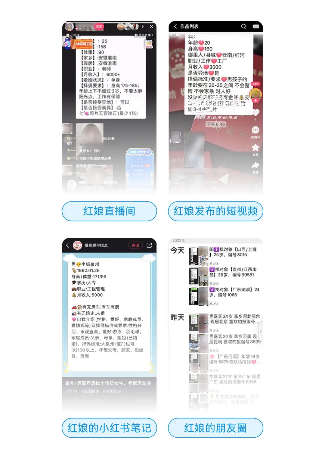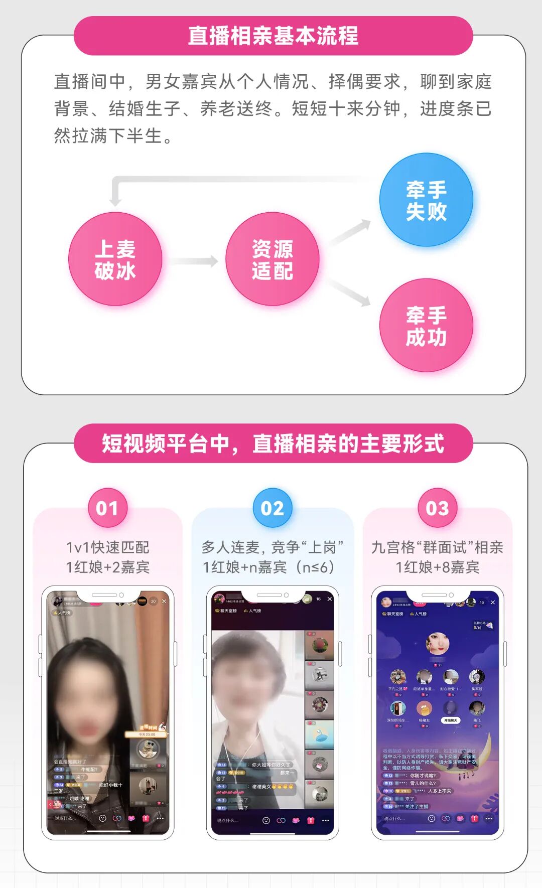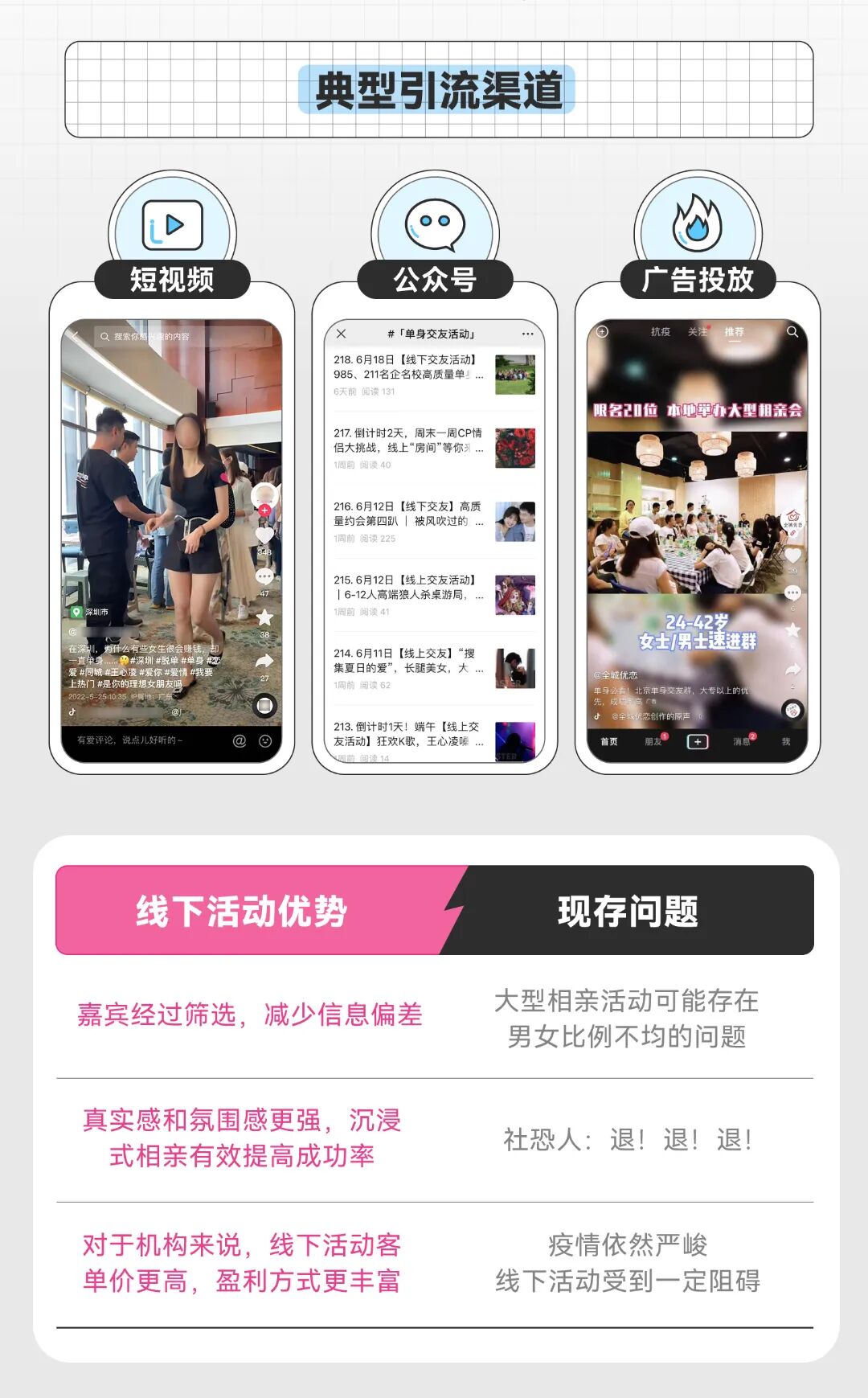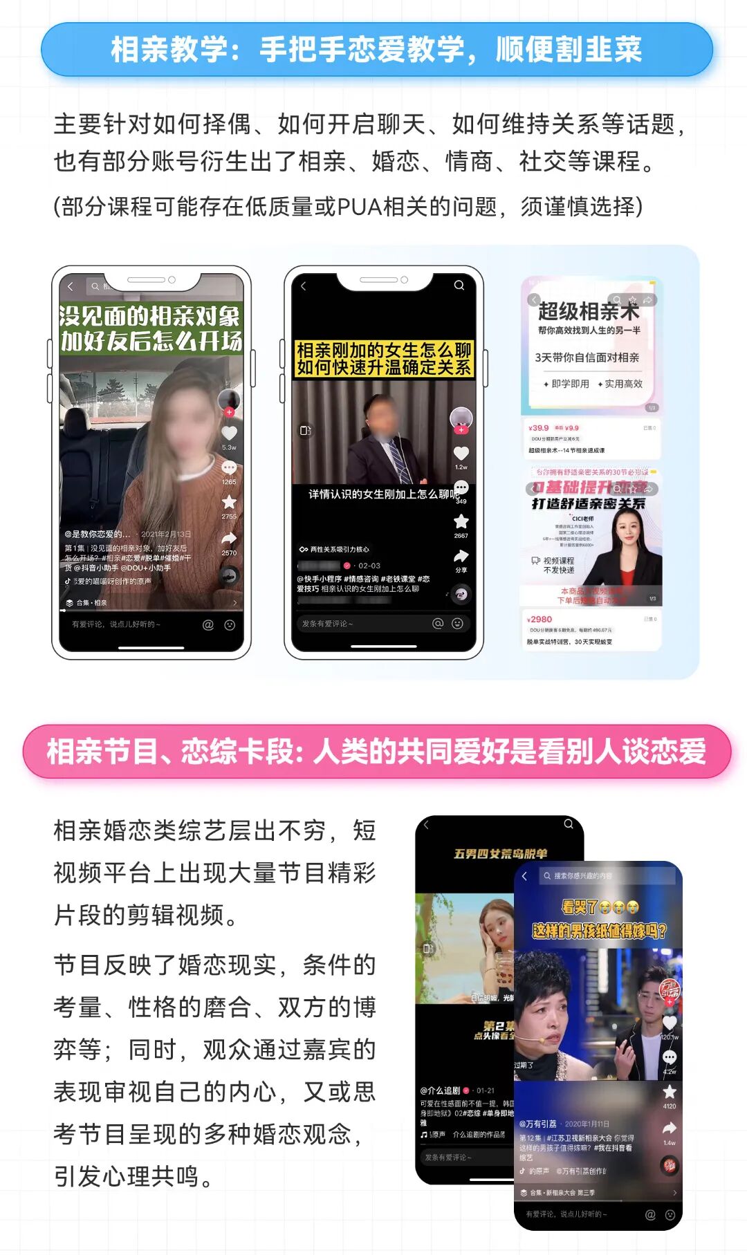 本以为离我们很遥远的相亲需求,随着恋综和梦华录的开播浮出水面。你的身边是否也有一群前一秒还高举单身大旗,后一秒就因为“嗑到了”而触发相亲需求的朋友?在过去的2021年,各大平台“相亲”相关的内容量和创作者逐步提升。抖音上,老年相亲节目的卡段视频合集播放量高达1.3亿;快手中,最火的红娘账号粉丝量超过650万。出于为仍是单身的朋友探探路的目的,新榜研究院发布自研报告《互联网相亲观察报告》,旨在通过观察互联网上的各类相亲模式,以及反映出的相亲人群众生相,为单身人群提供一点寻爱思路。数据显示,61.63%的单身青年没有机会接触到可发展恋爱关系的异性,30%的人表示每年能接触到的合适异性仅3个左右,社交圈过窄是导致单身的重要原因。在疫情的持续影响下,线下社交被迫按下了减速键,越来越多的人把情感诉求转移到线上,并开始尝试通过网络寻求一份感情寄托。互联网相亲突破线下有局限性的社交圈、以及疫情对线下活动的限制,成为了单身男女寻爱的新阵地。在“山寨版非诚勿扰”直播间里,聚集了一众单身男女,没有了美颜功能的加持,大家纷纷“坦诚相见”,从根源上避免了照骗和见光死的尴尬。在红娘的鼓励和引导下,直播间俨然成为了男女嘉宾的爱情加速器,他们接连上麦,你方唱罢我登场,迅速介绍自己和择偶需求。运气好的话,进度条从“你好”拉到“养老送终”只需要十分钟。部分红娘在直播间不断引导男嘉宾为心仪女嘉宾刷礼物,从上麦、进一步了解,到获取女嘉宾的联系方式等等,双方每一次拉近距离都可以成为红娘增加收入的机会。此外,直播间里还可能存在看似条件优质的“婚托”,他们长时间在麦上引导嘉宾刷礼物,以增加红娘和自己的收益。另外,网络信息难辨真假,在无法甄别对方真实身份的情况下,不可轻信对方的说辞或有经济往来。以相亲直播间为例,曾经确发生过男性花重金刷礼物换取心仪女性的联系方式,添加好友后又被拉黑的案例。从真诚求爱到“杀猪盘”,可能只有一场直播相亲的距离。2. 婚介所平替:海量单身资源,丰俭由人的服务套餐红娘通过直播、短视频、小红书笔记等方式展现其朋友圈的单身资源,引导感兴趣的用户添加红娘微信,以进行后续的交易和资源对接。这类红娘以团队形式“作战”,嘉宾资源共享,门槛和成本相对较低。引流至红娘微信后,红娘为女嘉宾免费发布自我介绍及择偶要求,男嘉宾则根据自身需求选择付费服务套餐。以快手平台上某位红娘的标准为例,收费从88元到666元不等,丰俭由人。但相比线下的传统婚介所,这类红娘收费具备明显的价格优势,可谓是婚介所“平替”。男嘉宾付费后,从红娘的朋友圈筛选心仪的女嘉宾,并由红娘代为转发资料。除高等级的服务套餐外,男嘉宾可选择的女嘉宾数量均有限制,且无论女嘉宾同意了解与否都算在介绍次数之内。男嘉宾有心仪对象时,红娘直接向女嘉宾推送信息,不会帮助男嘉宾美化信息也不给予建议,导致男嘉宾有一定几率浪费推送机会。同时也导致了资源匹配率低的问题,如北京月收入20k的硕士学历女性,收到的男嘉宾资源月收入3k-20k不等,学历从初中到本科不等。线上交友有风险,线下见面要谨慎。面对网友的见面邀约,切勿盲目前往。如确有赴约需求,尽量选择白天在人多的场合见面,注意保护好个人的人身财产安全。另外,疫情仍未过去,出示绿码也是必要步骤哦。国内外的相亲婚恋类综艺层出不穷,大量节目精彩片段的剪辑视频在短视频平台吸引了众多关注。这类节目反映了婚恋现实,如条件的考量、性格的磨合、双方的博弈等。观众们一边嗑糖,一边通过嘉宾的表现审视自己的内心,又或思考节目呈现的多种婚恋观念,引发心理共鸣。除此之外,短视频平台上还存在着大量的相亲或恋爱的教学视频,反向教学、现身说法、聊天技巧等各色恋爱套路令人目不暇接,还有部分账号开始售卖各种教学课程,价格从几元到几千元不等。当代社会快节奏的生活中,人们逐渐丧失了对爱情“车马很慢,一生只够爱一人”的郑重,开始追求速成。加之工作占据了大量时间时间,许多人深感自己聊天、恋爱的技能退化,需要相应的帮助,因而助长了这类视频的热度。我们常常被网络上的爱情故事所打动,期待偶像剧式的浪漫爱情;我们看了很多短视频,收获了许多大道理,却依然在现实里撞的头破血流。就像奇葩说中提到的,“我们在恋爱中遭了那么那么多的罪,从来不是因为我们没有上过恋爱课,是因为我们上了太多的课,而错过了真正的人生”。也许放下手机,减少网上冲浪,回归现实生活,增加现实交友,才是迈向脱单最重要的一步。相亲O2O则是由线上引流,最终回归线下相亲的模式。机构通过短视频、公众号等方式将用户引流至线下,参与相亲活动或购买课程。相亲活动的参与嘉宾均通过筛选,匹配度大幅提升。且面对面的沉浸式相亲,信任感更强,对于社牛来说,可以有效的提高成功率,而对于社恐的单身男女来说,则可能是修罗场般的历练。同时,机构还提供多类课程教学,从情感复盘、婚恋规划、相亲教学,到形象打造、情感挽回、实战模拟训练,可以说只有我们想不到的,没有机构教不了的。线下相亲活动多会根据参与嘉宾的某一特质分类,如硕士专场、留学生专场、北京户口专场,还有根据收入划分的百万年薪精英场等。许