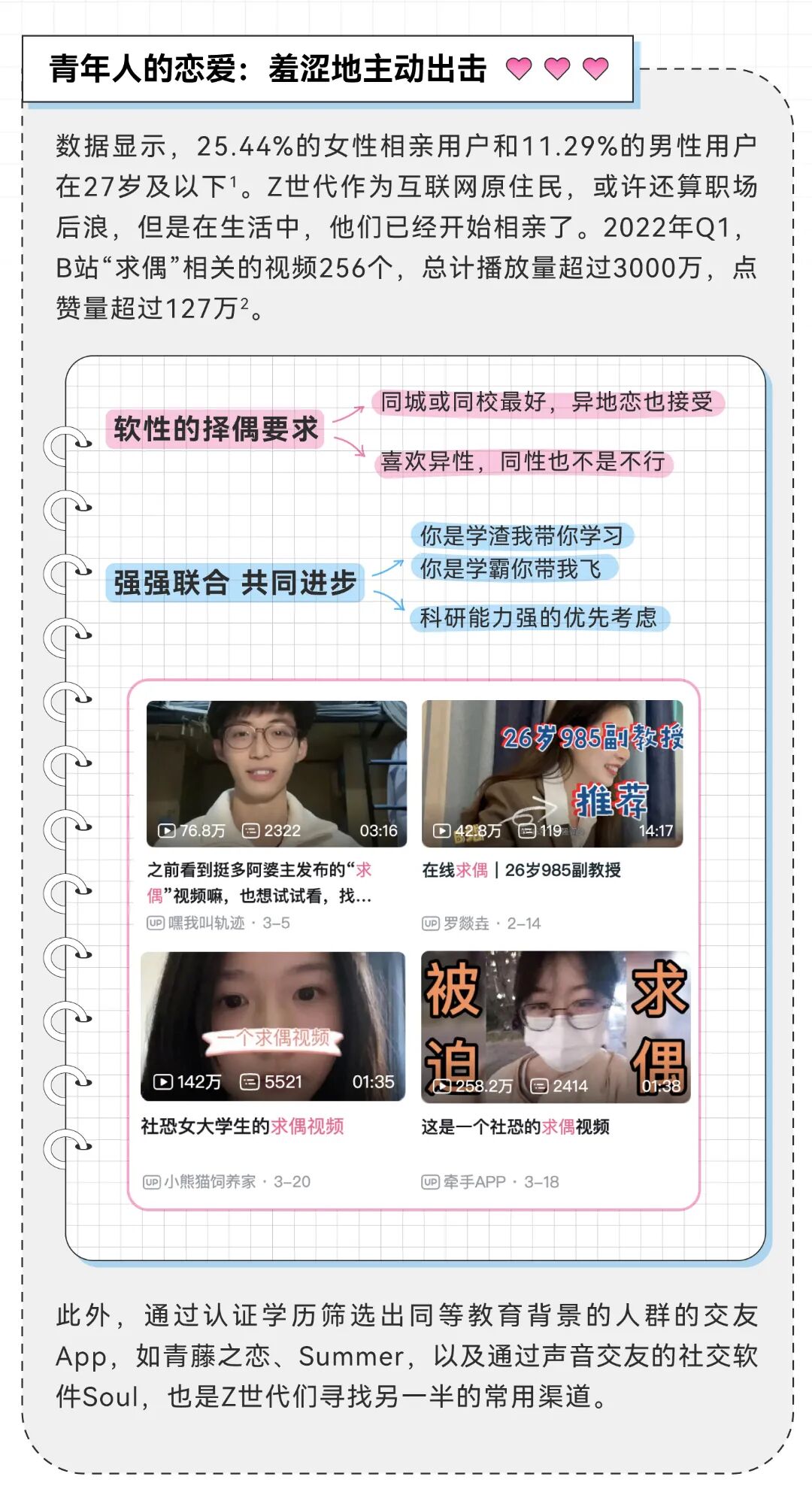 B站上,Z世代们的求偶视频引发了一波关注。UP主们略带调侃的自我介绍,羞涩而直接的表达着自己的诉求。“同城或同校最好,异地恋也可以接受”、“喜欢异性,同性也不是不行”,可以看到B站年轻人比较软性的择偶要求,及“以感觉为主”的恋爱观。同时,“你是学渣我带你学习,你是学霸你带我飞”、“科研能力强的优先考虑”,也可以看到青年人渴望和另一半强强联合、共同进步的诉求。
