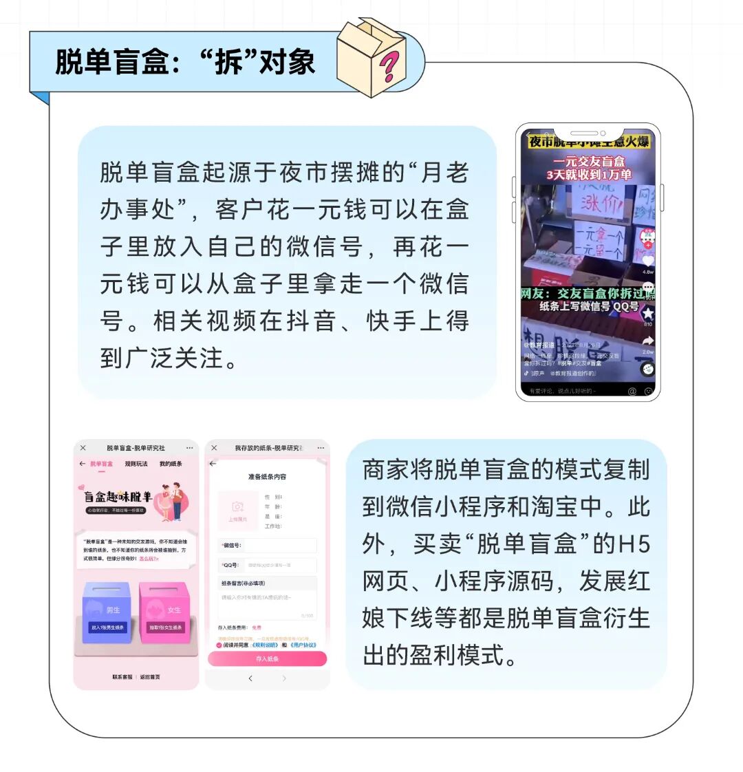 在这个“无处不社交”的时代,万事万物都为单身男女们提供着相亲机会。网易云音乐、豆瓣、支付宝理财社区、公众号的评论区纷纷变成大型相亲现场,通过这些以兴趣爱好为纽带的平台,可以更直接地筛选出与自己有共同语言的人群。除了兴趣爱好,游戏也是促进感情升温的利好方式。王者荣耀、和平精英、英雄联盟等游戏过程刺激,促使玩家荷尔蒙飙升,且队员之间存在互帮互助的关系,感情更容易升温。对于单身职场人们,职场社交软件“脉脉”成为了相亲交友的一大渠道。另外,在线共享文档“大厂er相亲文档”也曾在职场人中广泛传播。或许只有同为“社畜”才能更加理解彼此吧。有人在互联网中寻找爱情,也有人在互联网相亲中看到商机。从提供可以“拆”出对象的脱单盲盒,到相亲账号运营课程,再到被大众诟病的“彩礼贷”,或赚的盆满钵满,或被打压禁止,但不可否认的是,互联网相亲产业依然存在着一定的想象力。