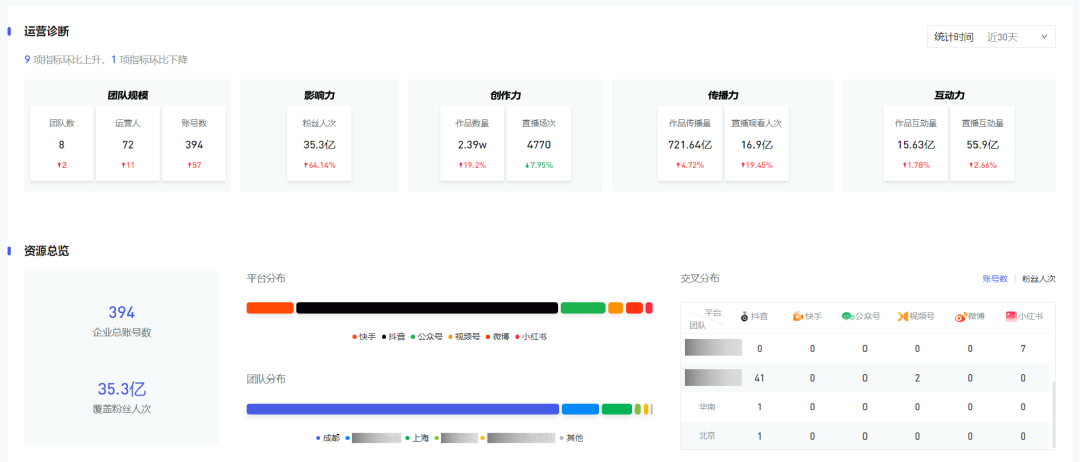 账号「仪表盘」基于可视化图表展示企业团队、账号及内容数据,帮助管理者全方位观测媒体矩阵运营现状并快速挖掘有价值的资源。