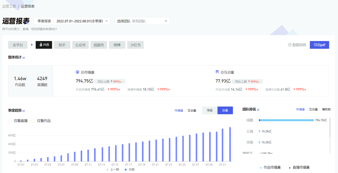 矩阵通「运营报表 」融合各平台图文、直播、短视频数据,自动按周/月/季度快速形成账号运营报表,展示团队趋势数据及排名情况,缩短数据统计时间,提升运营复盘效率。