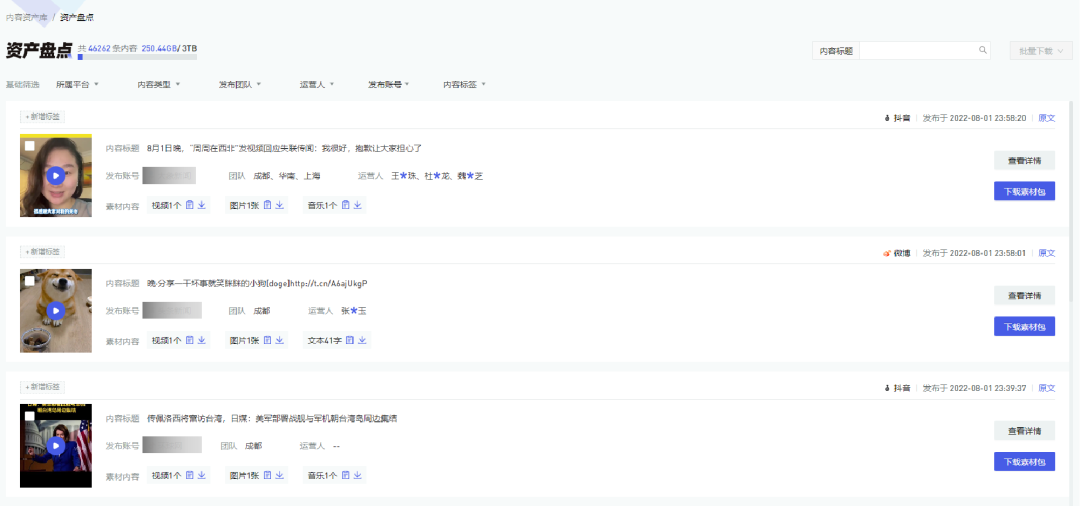 「内容资产库」提取视频、音乐、文本等信息,自动分类作品素材,支持对存储资产进行打标签,通过标题、所属平台、内容类型、内容标签等条件筛选,可快速定位目标内容。