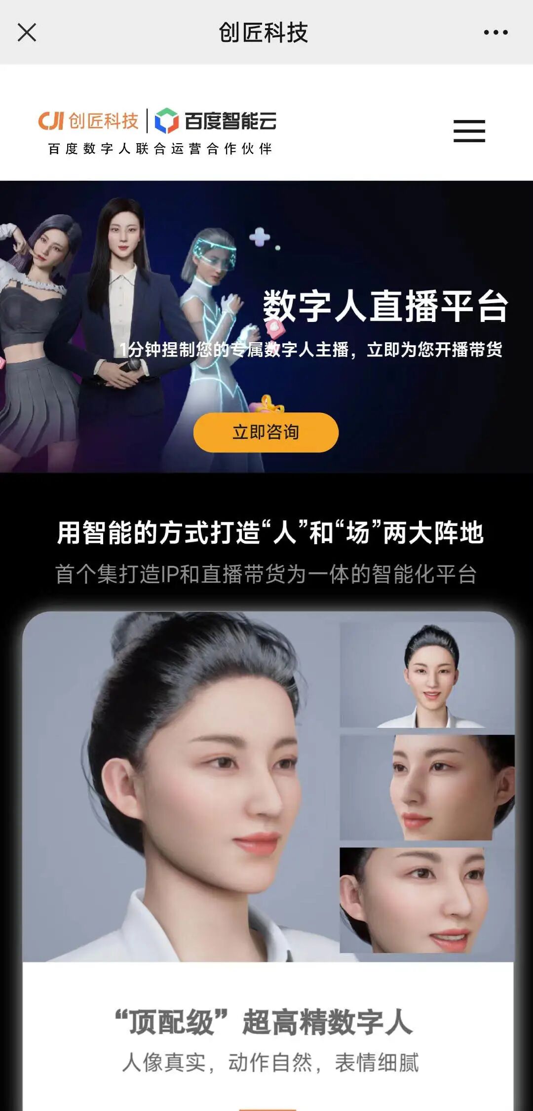 今年初,蓝色光标发布虚拟人苏小妹,进军虚拟人市场,这背后离不开阿里在大数据方面的支持。创匠科技之所以能顺利开展虚拟人业务,除了本身的技术积累,很大一部分原因则是百度在人工智能等方面的支持。创匠科技创始人刘卫透露,其与百度的合作模式是创匠科技担任产品经理、前端运营角色,百度则负责平台搭建、技术支撑。“我们的虚拟人技术100%来自百度”,刘卫补充。7月21日,在2022百度世界大会上,百度和创匠科技联合发布了数字人直播平台。图源:网络运营方面,根据资源、目的不同,目前业内的虚拟人公司主要有四类背景。1. 游戏动画影视公司,这类公司的优势是IP版权和内容运营。