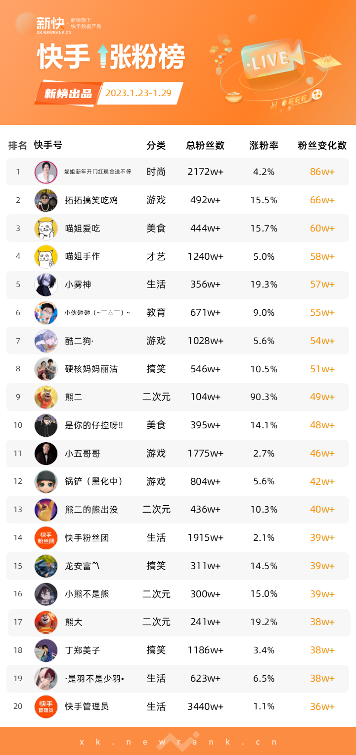 依托新榜旗下全场景AI数据平台“新快”,新榜推出「快手涨粉榜」,本次统计周期为2023年1月23日到2023年1月29日。“妮姐 新年开门红现金送不停”一周涨粉超86万,位列本期快手涨粉榜第一。统计周期内该账号连续7天进行了16场带货直播,单场预估销售额最高超过1500万。“拓拓搞笑吃鸡”是一名直播“和平精英游戏”的主播,位列本期涨粉榜第二,一周涨粉超过66万。ps. 如果觉得不够看,请登录新榜旗下快手全场景AI数据平台“新快”(xk.newrank.cn)查看各分类快手榜单!