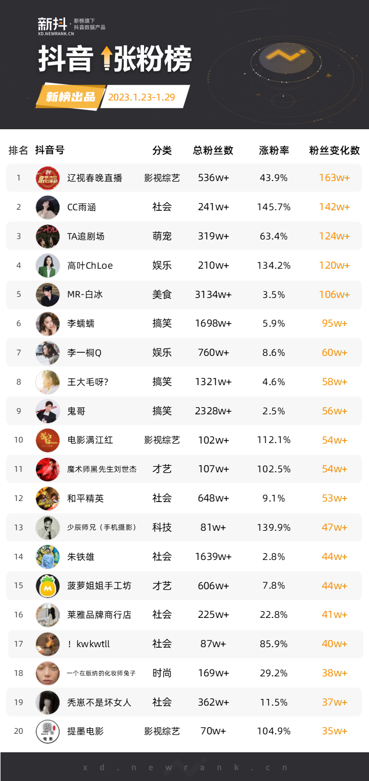 依托新榜旗下全场景AI数据平台“新抖”,新榜推出「抖音涨粉榜」,每周一期。本次统计周期为2023年1月23日到2023年1月29日。“辽视春晚直播”位列本期涨粉榜第一位,一周涨粉超过163万,统计周期内该账号每日直播辽视春晚回放,并发布了31条相关节目视频。“CC雨涵”位列涨粉榜第二位,一周涨粉142万。她凭借一条“不婚主义小姨过年发红包”的视频出圈,单条视频获赞超千万。