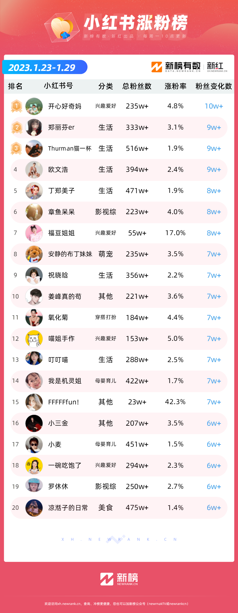 依托新榜旗下全场景AI数据平台“新红”,新榜推出「小红书涨粉榜」,本次统计周期为2023年1月23日到2023年1月29日。“开心好奇妈”位列本期小红书涨粉榜第一,一周涨粉超10万。她是一对双胞胎姐妹的妈妈,账号内容主要为亲子日常,统计周期内未发布作品。“郑丽芬er”位列本期涨粉榜第二,一周涨粉超9万。他常常一人分饰多角演绎搞笑段子,统计周期内发布与过年生活的相关作品引发网友共鸣。凭借唠嗑讲故事走红的设计师“Thurman猫一杯”多次登上涨粉榜,位列本期第三位,一周涨粉超9万。ps. 如果觉得不够看,请登录新榜旗下小红书全场景AI数据平台“新红”(xh.newrank.cn)查看各分类小红书榜单!