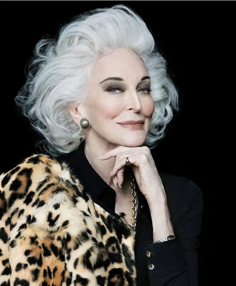 发型参照了87岁的鹤发超模Carmen Dell'Orefice。