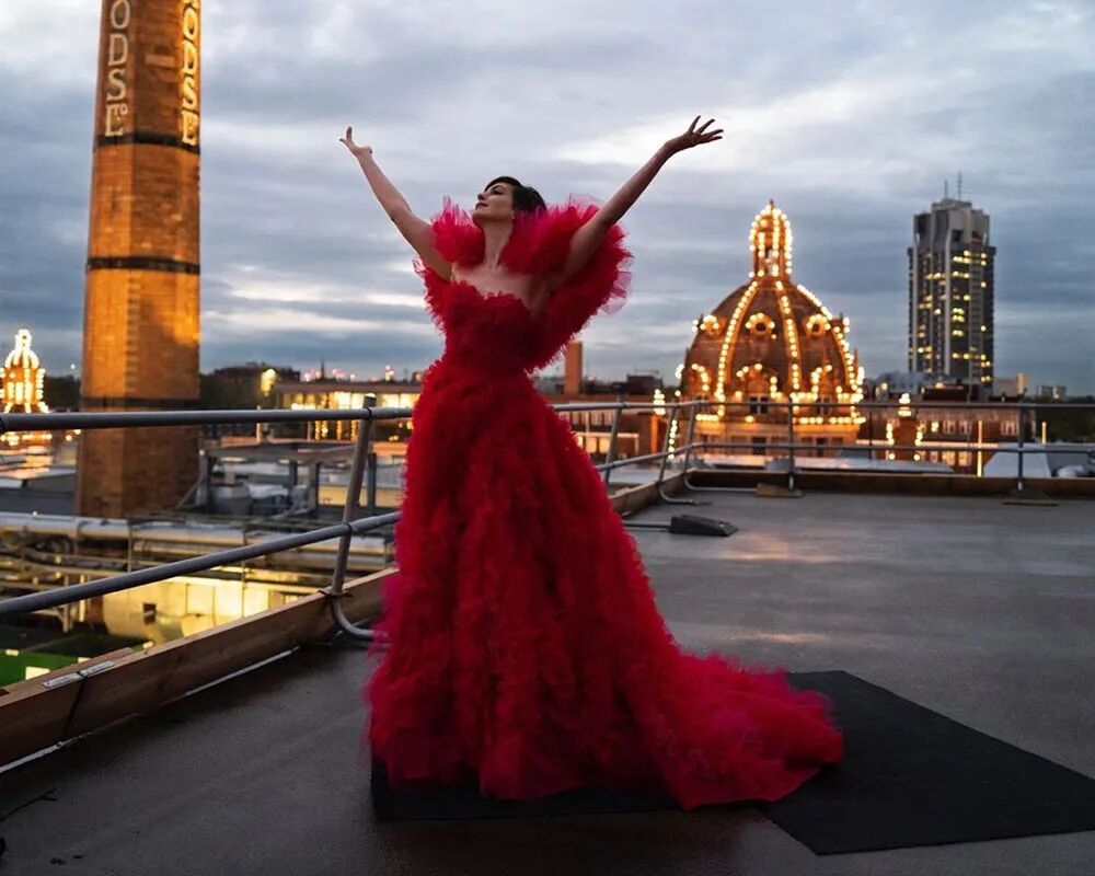 于是安妮·海瑟薇就穿着Ralph&Russo高定花朵红裙,在Harrods百货的屋顶拍了一组“中国女明星式”的出发写真。