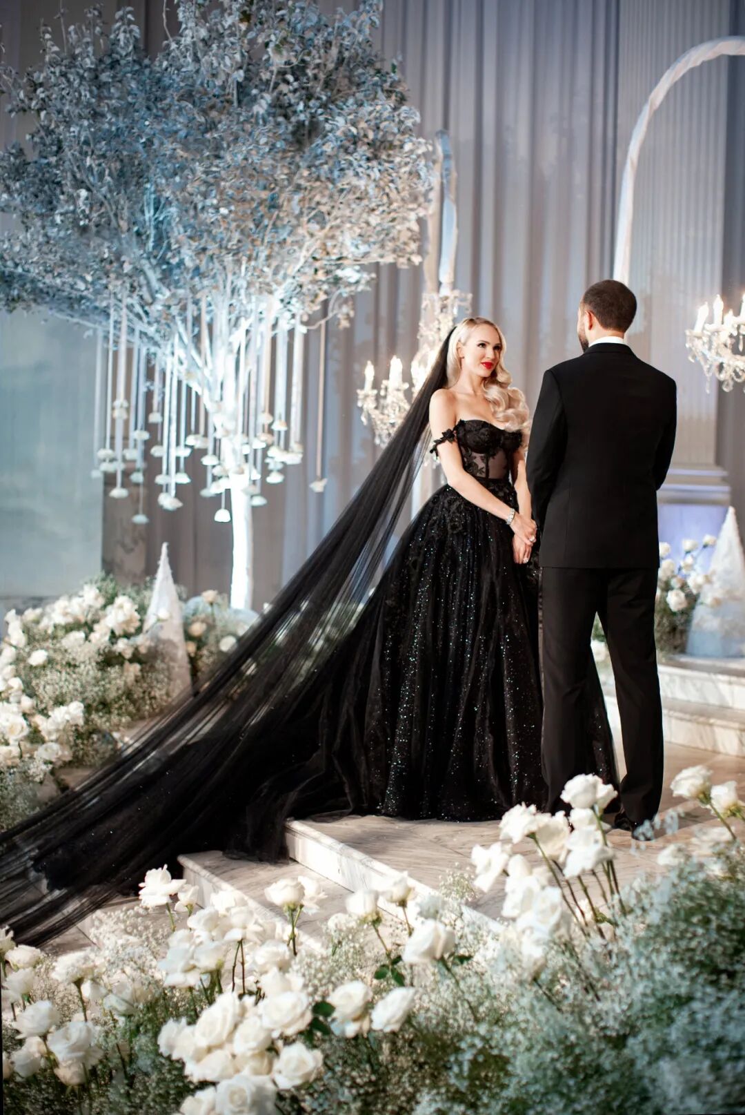 为了与众不同,她不穿白色,定制了一身黑纱,光是头纱就长达6米7。