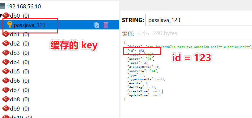 保存的 id 是自增的,值为 123,所以缓存中的 key = passjava_123。