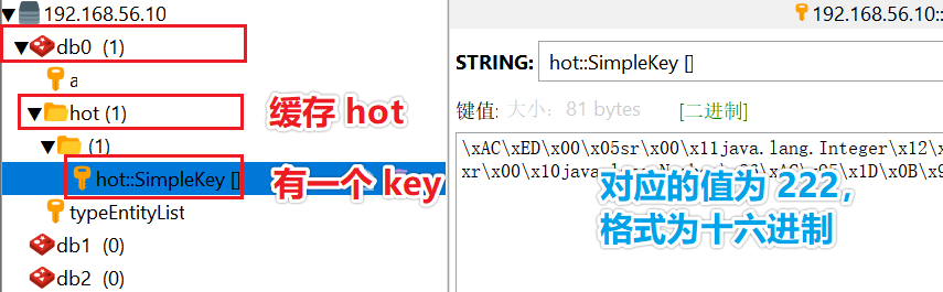 调用 test 方法后,Redis 中就创建出了 hot 缓存了,然后缓存了一个 key,如下图所示:
