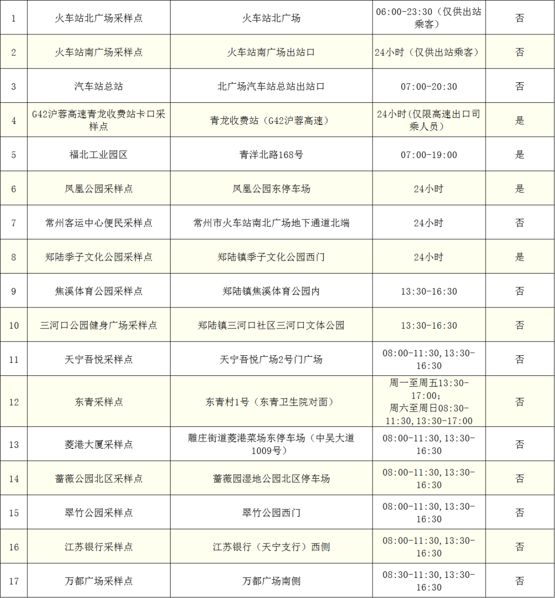 | 15 | 新北区三井街道中央艺术公园采样点 新北区中央艺术公园东区(珠江路130号) | 24小时采样 |