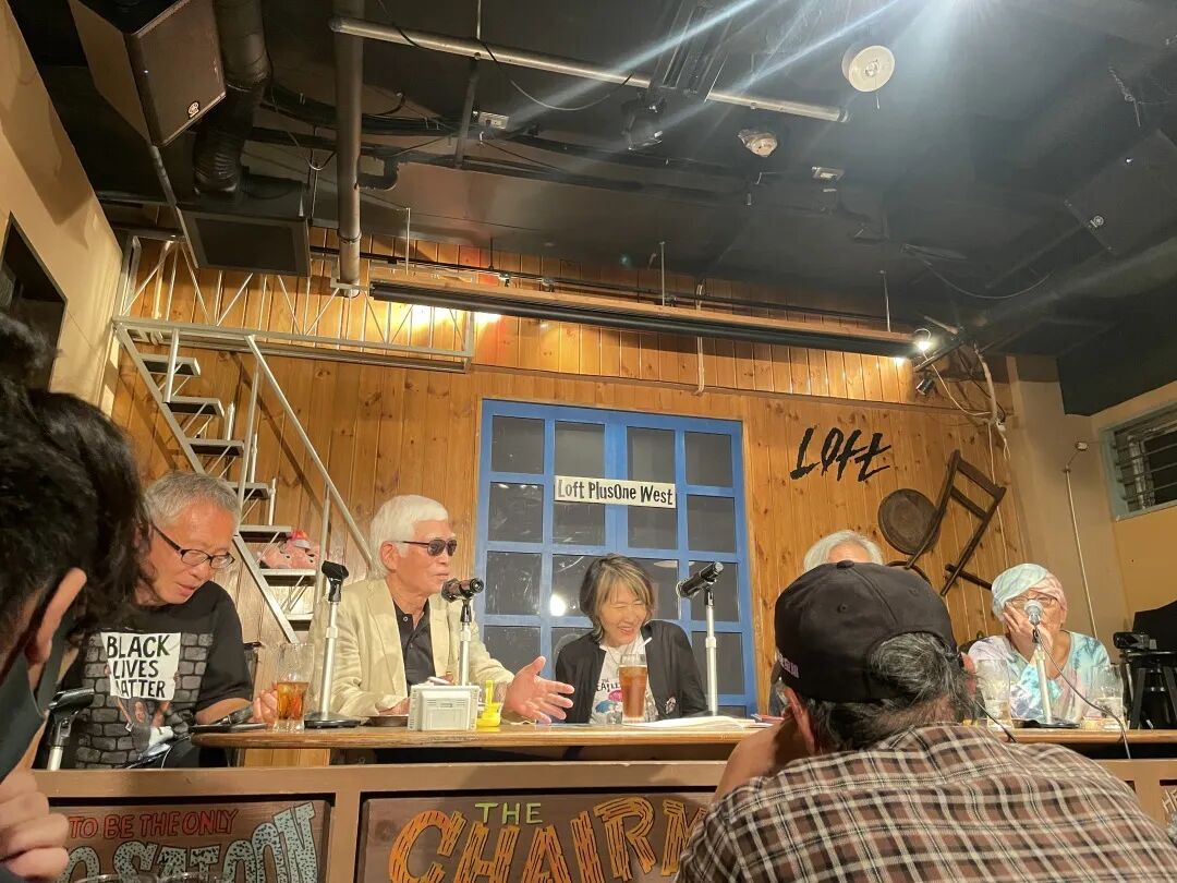 这个场地平时是作 livehouse 使用的,我6点15分到时,检票队伍已经从楼下(会场在地下二层)排到楼上。进场后我发现已经坐满(据说当晚是有200人+),只能坐在靠近门口的位置。从我的位置看出去,大屏幕还刚好被柱子挡住,幸好会场好几个地方包括门口有几台电视屏幕同时播放,才能完整的看片。可能是因为放映时间原因(当日是周一工作日),现场观众有很大部分是西装衬衫提公文包的上班族。这其中中老年人占了绝大部分,年轻人肉眼可见的少(我周围就基本都是爷爷辈的),现场还有电影的演员和工作人员包括摄影道具场务们都坐在观众席中,放映后都有起来和大家打招呼。同时,现场来了非常多日本独立电影圈内人士,导演记者翻译作家等等。而纪录片导演森达也在影片一结束就被主持人井上淳一叫出来问观后感。