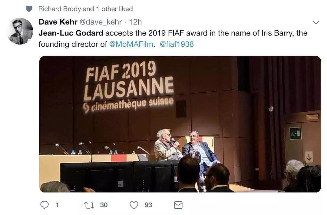 戈达尔接受FIAF搬给他的2019 FIAF award, 并接受采访