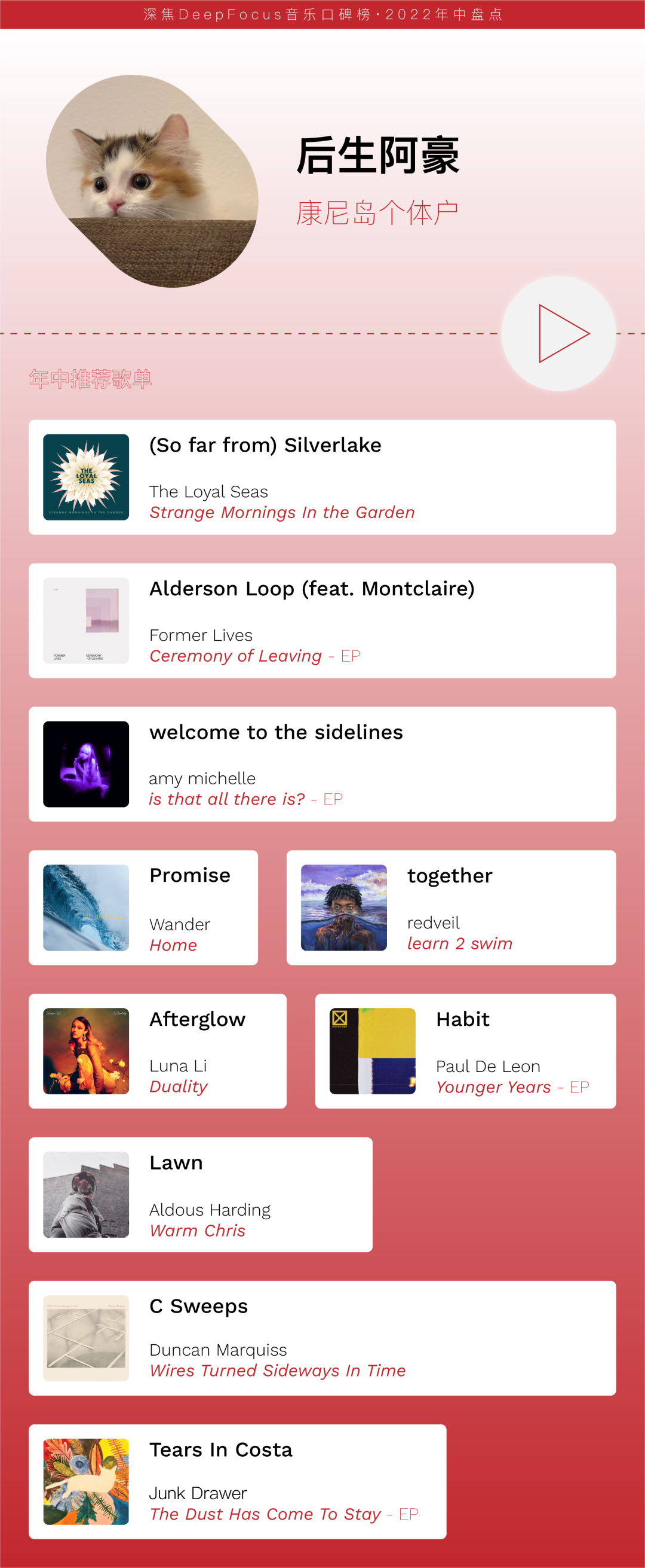 深焦音乐口碑榜进入到第5期,本期我们尝试做一次年中盘点,邀请各位作者列出上半年的个人推荐歌单。作为QQ音乐“编辑甄选:2022年中音乐推荐”策划的一部分,深焦音乐口碑榜编辑部的年中推荐已以歌单形式上线QQ音乐。略有遗憾的是,不少歌曲并未被QQ音乐收录,此次以微信图文形式推送的是完整版编辑部推荐。