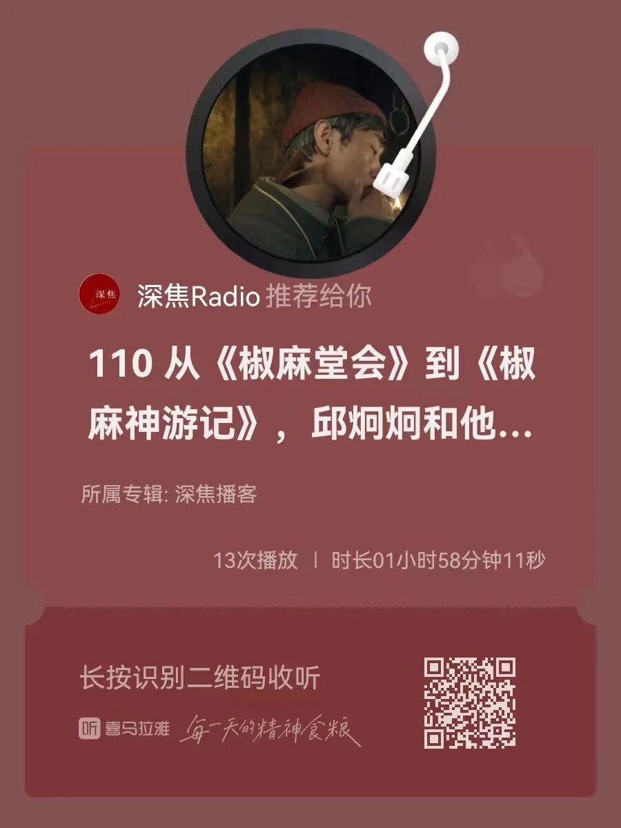 我们也借此机会做了一期关于导演、画家邱炯炯的播客,这是深焦播客史上人数最多、也是嘉宾阵容最豪华的一期。邀请到了《椒麻堂会》的导演邱炯炯、制片人丁丁、美术指导吕欣,作家贾行家、周恺,一起来聊一聊邱炯炯和他的椒麻宇宙。