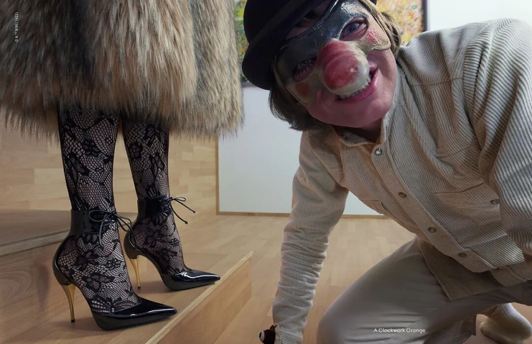而《发条橙》的出现则代表着更为野性的人类行为,在它的片段中,可以看到adidas x Gucci带来的自由的感触,一种打破束缚的精神。当然,电影中的Alex足够叛逆,但这份叛逆伴随着他举起来的迷幻牛奶显得如此迷人,服装对应着广告片段中人物的心境想法,而电影广告外的人也在欣赏这充满艺术性的服装设计。