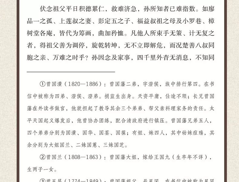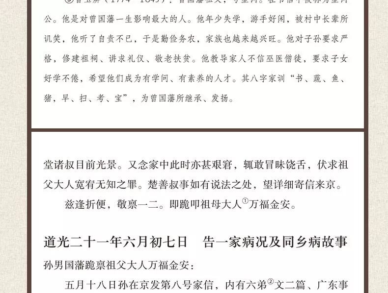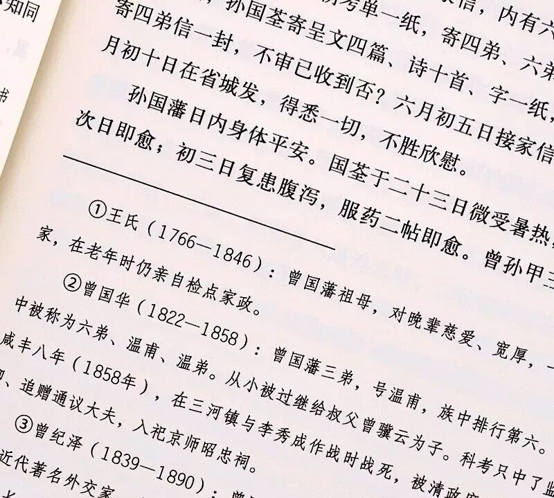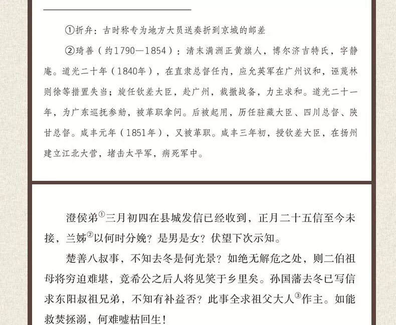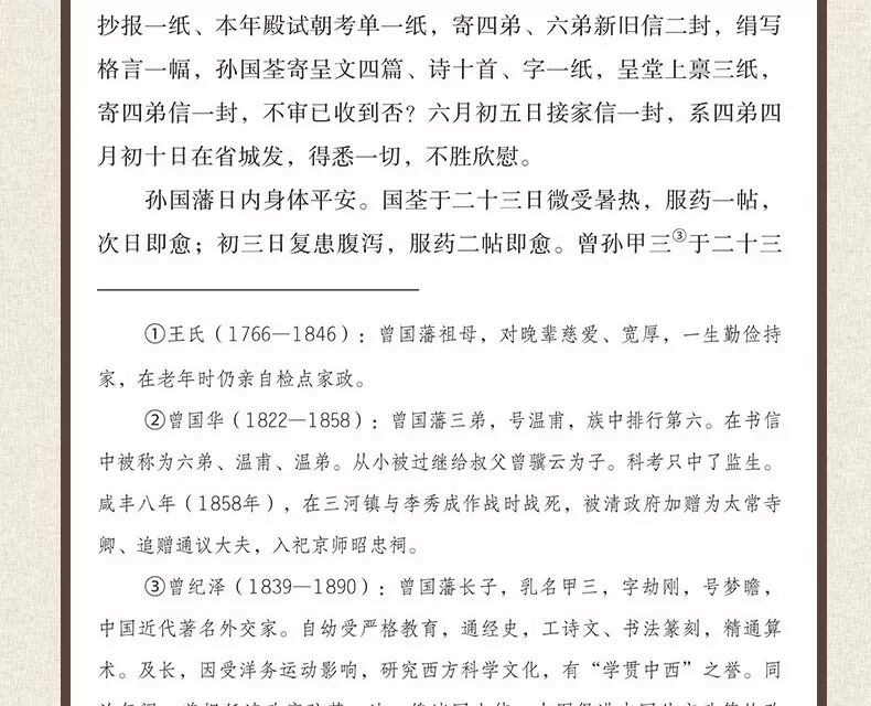 本书的注释,除了历史人物介绍外,还包括不为今人所熟知的一些词语。这些是以脚注的形式出现的。另外,书信中出现了一些干支纪年,不方便今人阅读,本书用年 号纪年做了圆括号注。此外,书信中还出现了六角括号注,这些则是曾国藩本人、其学生李鸿章等所加。—有了这些注释,即使没有所谓的“文白对照”的翻译,全 书阅读起来也不会有什么困难。