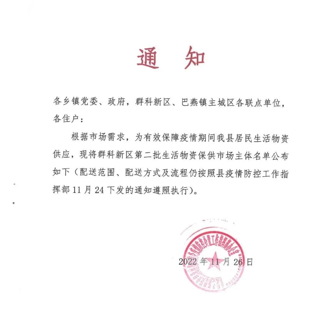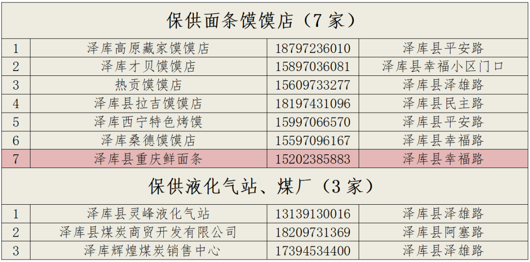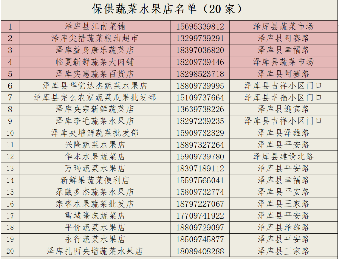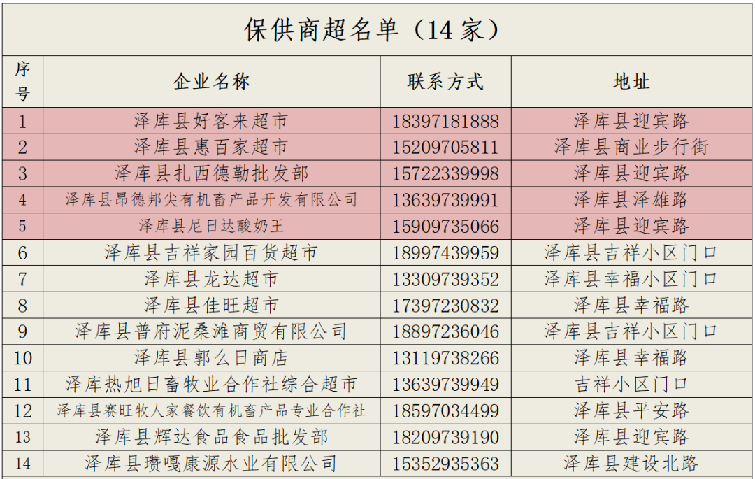 为进一步有效保障县主城区疫情防控期间基本生活物资供应,满足群众基本需求和疫情防控工作要求,现在原有保障供应点的基础上增加3家商超和3家牛羊肉铺,取消1家蔬菜店,共设立53家保障供应点。生活物资供应点中由浅红色标注的15家商店通过泽库县永健外卖平台下单,由专人负责免费配送。其余商家由居民联系商户自行下单后,由县工业商务和信息化局派专人配送(当天12:00之前下单的当天配送,12:00以后下单的第二天配送)。具体供应点名单如下: