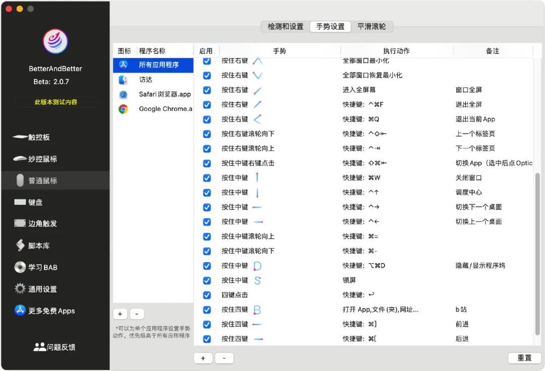 Better And Better 正是这样一款集合了鼠标手势、键盘全局快捷键、触摸板手势、情景模式设置等等功能的软件。