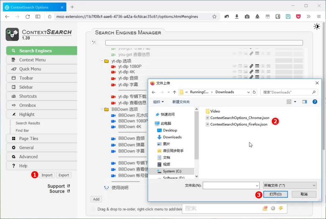 然后,打开扩展的设置页面,导入奶酪的配置 ContextSearchOptions.json。